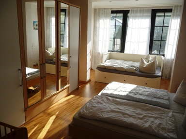 einen Wohn- Schlafraum mit 2 Bettcouchen und zusätzlicher Sitzmöglichkeit im Erker,